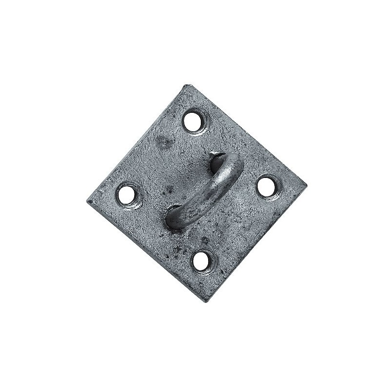 Anneau soudé sur une plaque de métal de 5 mm d’épaisseur équipée de 4 trous de fixation pour vis à tête conique. Plaque de 5 cm de côté, anneau de 2,5 cm d’encombrement, intérieur 20 x 14 mm. Galvanisé à chaud.
