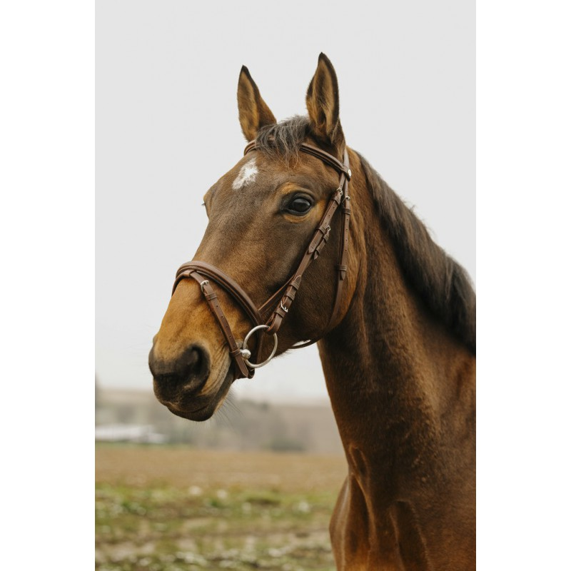 Le charme naturel.- Confort premium : Muserolle combinée et têtière découpée, doublées de cuir de vachette.- Design raffiné : Frontal et muserolle bombés carrés pour une touche d’élégance classique.DÉTAILS :- Boucles en acier inoxydable.- Cuir de buffle huilé très résistant.Vendu sans rênes.