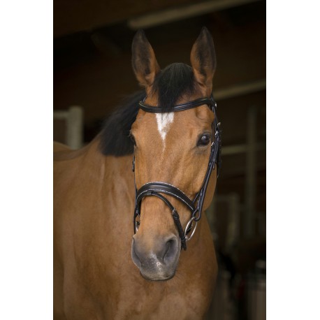 Bridon en cuir de buffle avec têtière et frontal doublés cuir vachette. Muserole surmontée en haut et en bas de fines bandes de petits strass, doublée cuir vachette. Coutures noires pour le cuir noir et couture blanches pour le cuir havane. Crochets sur les montants de mors. Bouclerie en inox. Vendu sans rênes.