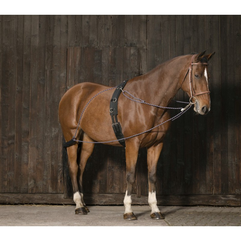 Un enrênement très complet, qui favorise à la fois une bonne tenue de l’avant-main, une grande mobilité du dos et l’engagement des postérieurs du fait de son système à poulies et de son attache sur la partie supérieure du surfaix.