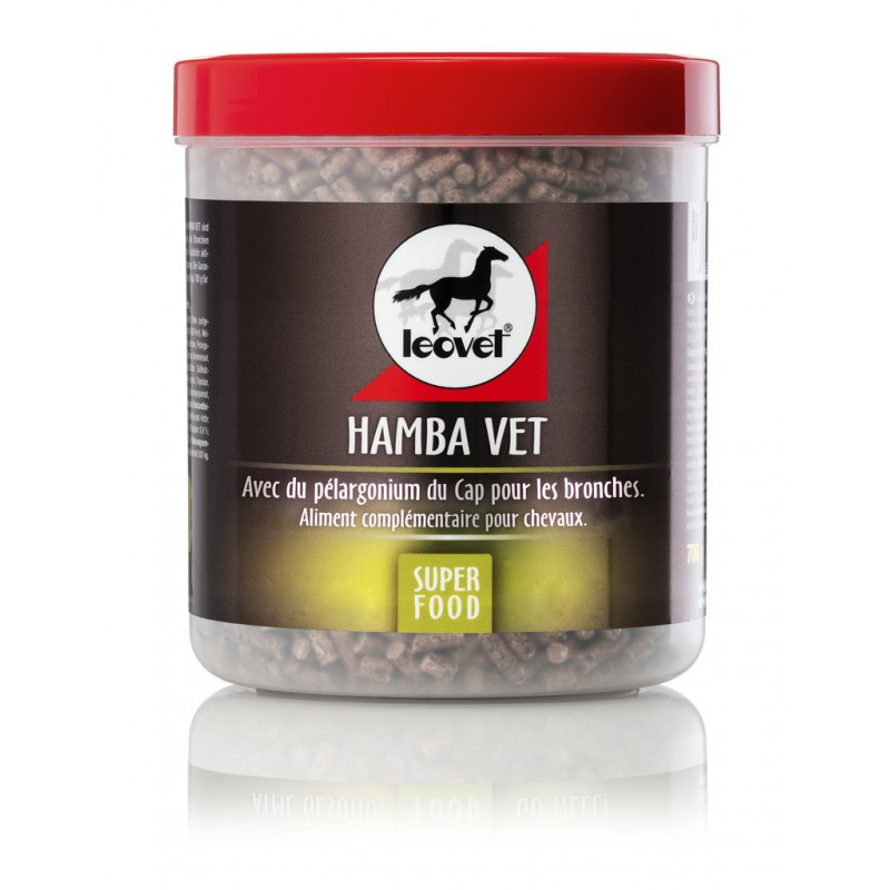 Avec du pélargonium du Cap pour les bronches. Les plantes utilisées sont connues pour leur effet bienfaisant sur les bronches. Le système immunitaire est activé. Il suffit de mâcher et de respirer. Nourriture saine garantie avec seulement 25 g/jour. 700 g pour 4 semaines. Composition : Orge, marc de pommes, maïs (ouvert), son de blé, tourteau de soja (sans OGM), blé, maïs, mélasse, dextrose, pélargonium sidoides 1 %, luzerne, prêle, ortie, aiguilles d’épicéa, tussilage, feuilles de menthe, racine de réglisse, plantain, racine de guimauve, fenouil, thym, chlorure de sodium, carbonate de calcium. Additifs : Phosphate monocalcique, arômes. Conservateur : Propionate de calcium E282. Constituants analytiques : Protéines brutes : 13,0 % , Sodium : 0,3 % , Huile et graisse brutes : 3,0 % , Calcium : 1,9 % , Fibres brutes : 7,8 % , Phosphore 0,4 % , Cendres brutes : 8,4 % , Teneur en humidité : 12,3 %. Recommandation alimentaire : Dose quotidienne de 25 g pour un cheval de 500 kg. À conserver dans un endroit frais et sec.
