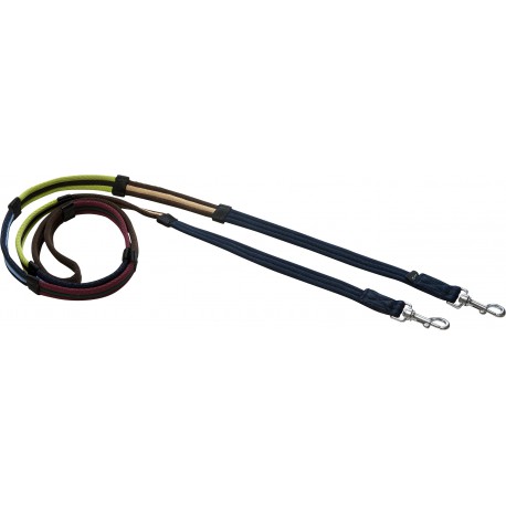 Rênes matelassées en polyester, divisées en 4 sections de couleurs différentes avec arrêtoirs, pour faciliter l’apprentissage du positionnement et de la fixité des mains. Se fixent au mors à l’aide d’un mousqueton tournant en zinc finition satinée.