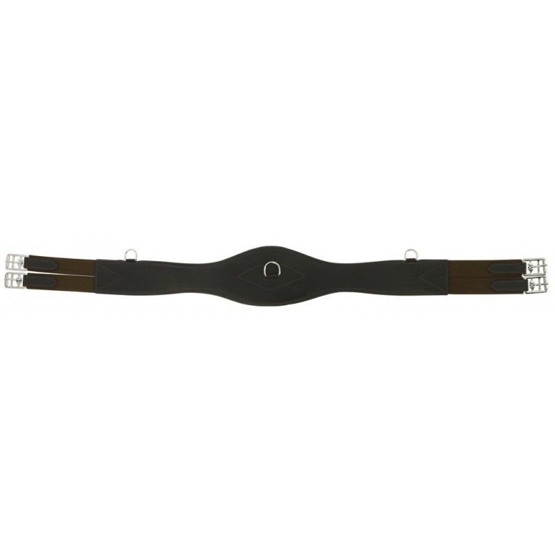 Sangle en cuir de buffle entièrement matelassée et doublée cuir vachette. Equipée d’un anneau central et de deux anneaux latéraux. Boucles à rouleaux en inox montées sur support élastique double épaisseur de part et d’autre.