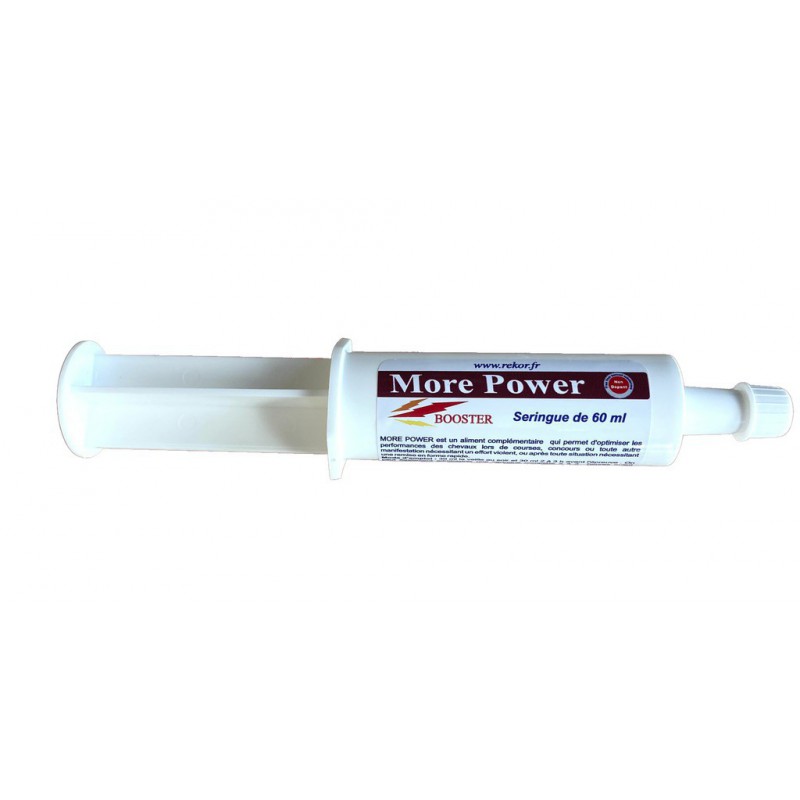« More Power » est un booster de tout premier ordre qui permet d’optimiser les performances des chevaux lors de courses, concours ou toute autre manifestation nécessitant un effort violent. Sa présentation en teinture mère en fait un produit très rapidement assimilable (dans les 2 heures qui suivent son administration). « More Power » permet d’optimiser les performances des chevaux lors de courses, concours ou toute autre manifestation nécessitant un effort important. Indications : chevaux ayant besoin d’un apport d’énergie immédiat, bref et puissant. Chevaux devant fournir des efforts intenses répétés et ayant besoin d’une récupération rapide. Composition : Dextrose monohydraté, sorbitol. – Additifs : Eleutherocoque (eleutherococcus senticosus) 700.000 mg/lt, Gingembre ( zingiber officianalis) 300.000 mg/lt. Constituants analytiques : humidité 99,5%, protéines brutes 0%, matières grasses brutes 0%, cendres 0,5%. Mode d’emploi : 40 ml la veille au soir et 40 à 60 ml 2 heures avant l’épreuve. On peut également administrer uniquement 60 ml 2 heures avant l’épreuve, ou une seringue pâte complète. Précautions d’emploi : produit formulé pour les chevaux. Conserver à température ambiante, à l’abri du soleil direct et hors gel. Bien refermer après chaque utilisation. Tenir hors de portée des enfants. Ne contient aucune substance susceptible de contrevenir au règlement de la FFE, FEI et du code des courses.