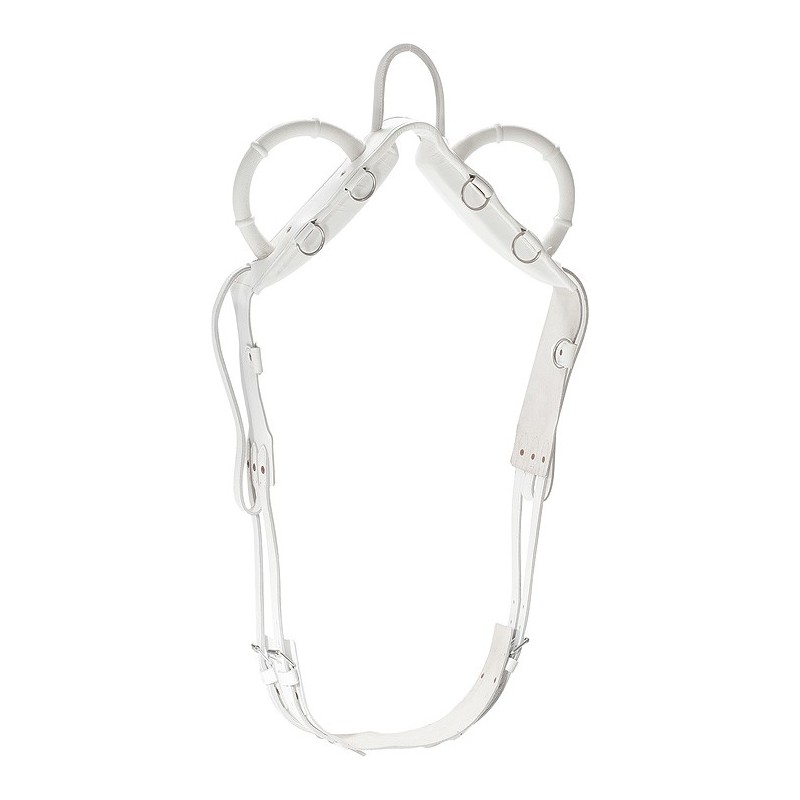 Surfaix en cuir de buffle d’une largeur de 14 cm pourvu de deux poignées arrondies et fixes de 11,5 cm de haut et 13,5 cm de large, d’une poignée centrale en cuir souple. L’avant est équipé de six anneaux métal sur le dessus permettant de fixer divers enrênements. La sous-ventrière est dotée d’une double fixation avec double réglage.