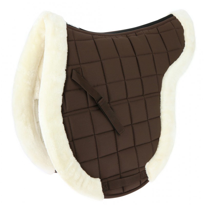 Tapis en forme de selle en polyester et coton (dessus polyester et dessous en coton), matelassé polyfill 300 g/m² et 10 mm de mousse. Équipé d’un tissu mesh au niveau de la gouttière pour permettre une meilleur ventilation, de pattes d’attache auto-agrippantes et de passages de sangle. Mouton synthétique au niveau du dos et sur les bordures permettant d’assurer un meilleur confort pour votre cheval. Pour une utilisation au quotidien.