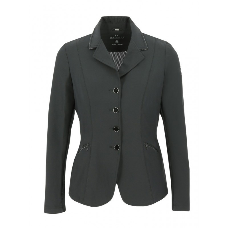 Veste de concours pour un confort maximum grâce à ses empiècements en mesh au dos et sous les bras. Textile déperlant, respirant, stretch et léger. Galon brillant en bordure de poches avant. Fermeture par 4 boutons. Composition : 84 % polyamide, 16 % élasthanne. Lavable en machine à 30°C.